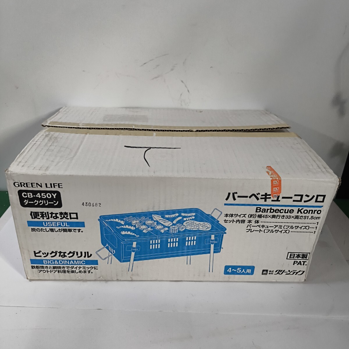 > 「1FE110」長期保管未使用品 グリーンライフ バーベキューコンロ 4~5人用 CB-450Y サイズ約:幅45X奥行き33X高さ51.5cm (240903)