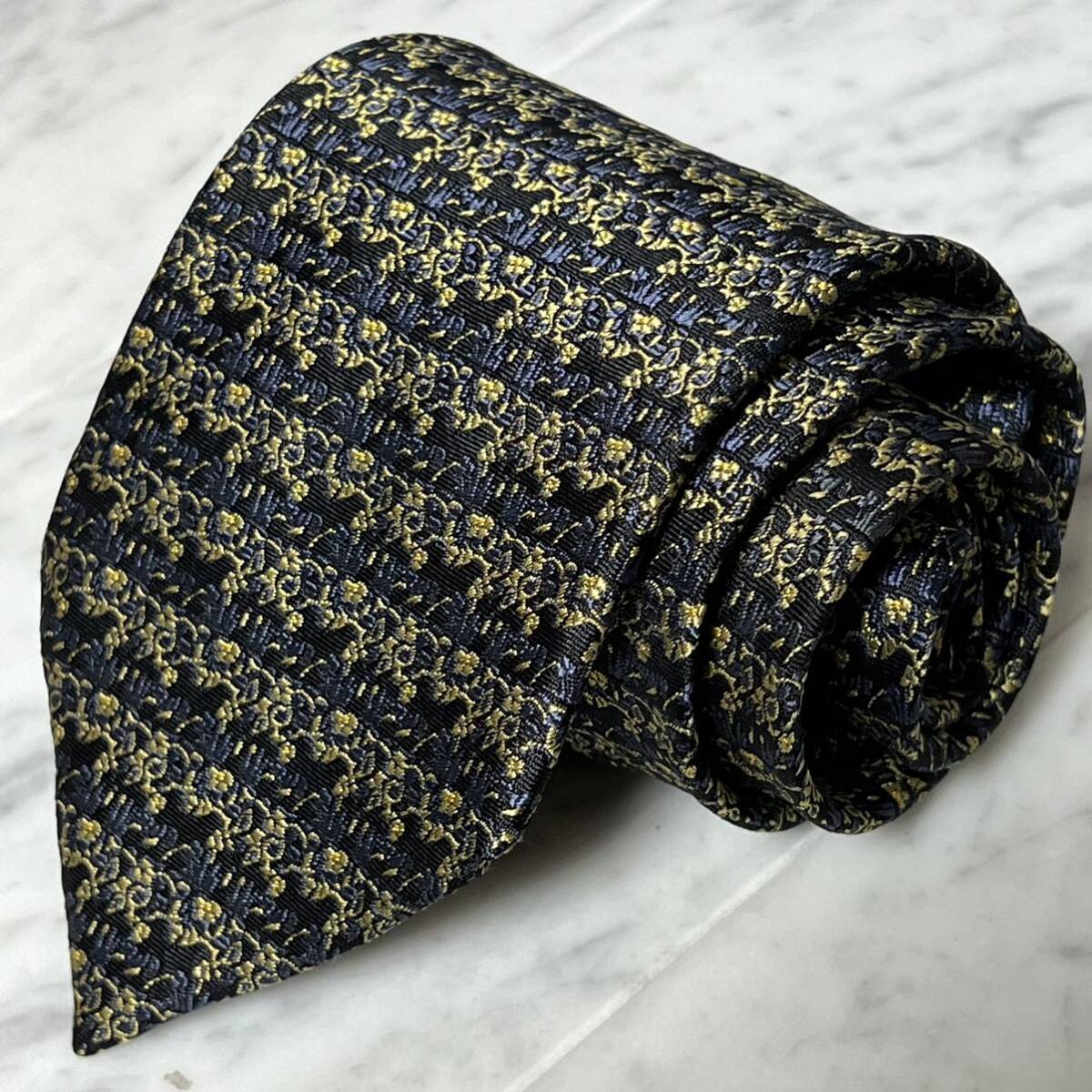 - 【美品】 999円~ KIMIJIMA ネクタイ ネイビー ゴールド系 ボタニカル柄 (B10)