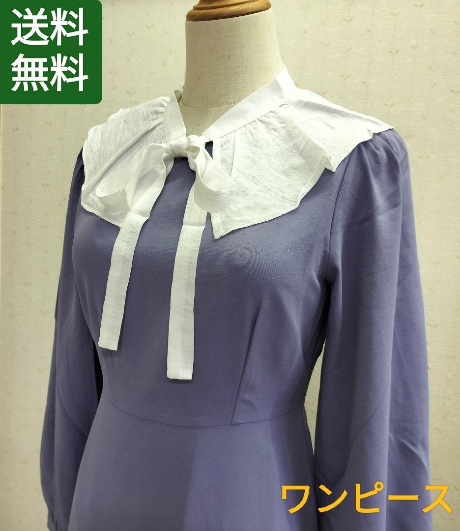 - 【送料無料】レディース 2WAY フリルの襟付き 長袖ワンピース ラベンダーM
