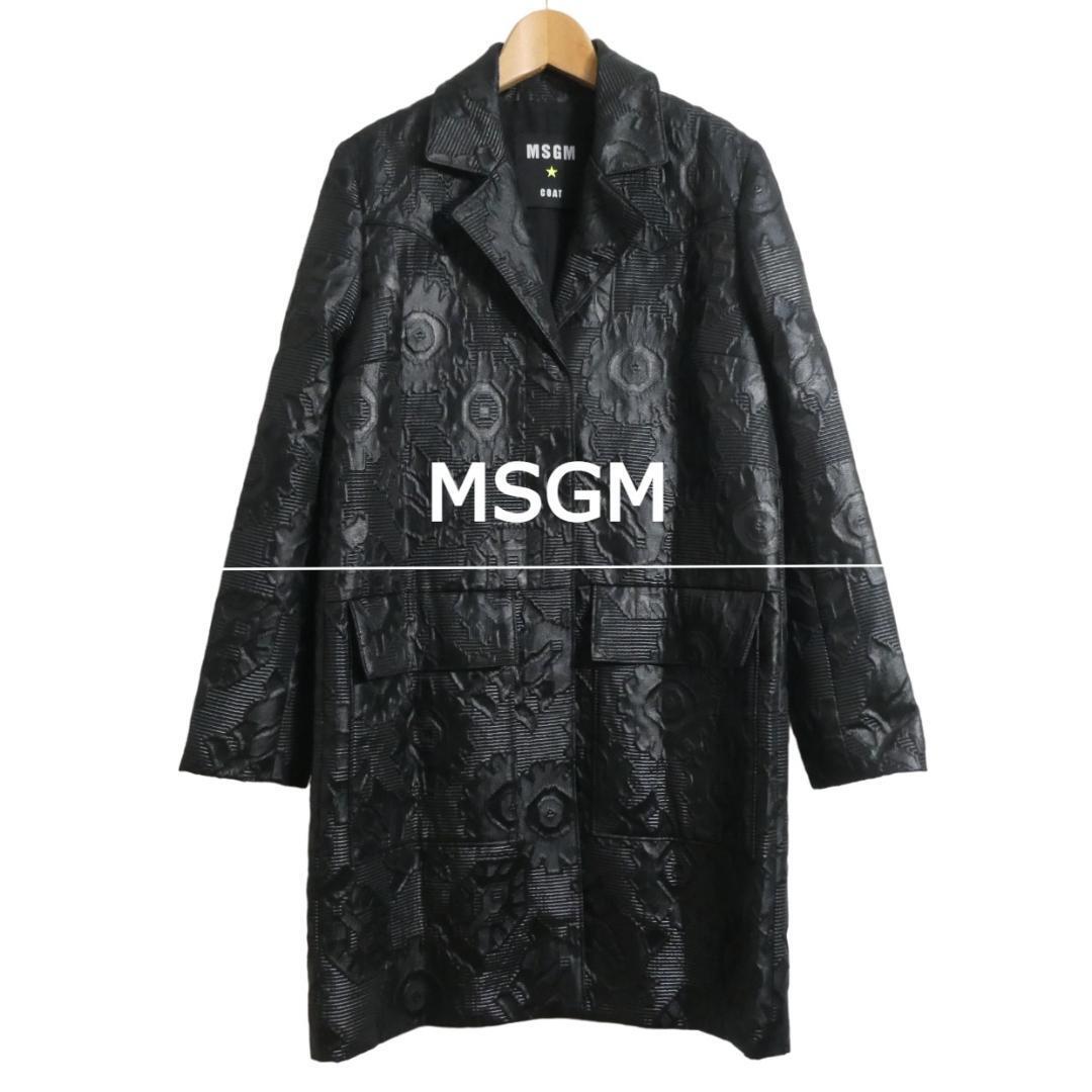 > 極美品 MSGM エムエスジーエム サイズ38 フェイクレザー 花柄 総柄 比翼ボタン ロング丈 チェスターコート レザーコート 黒 ブラック