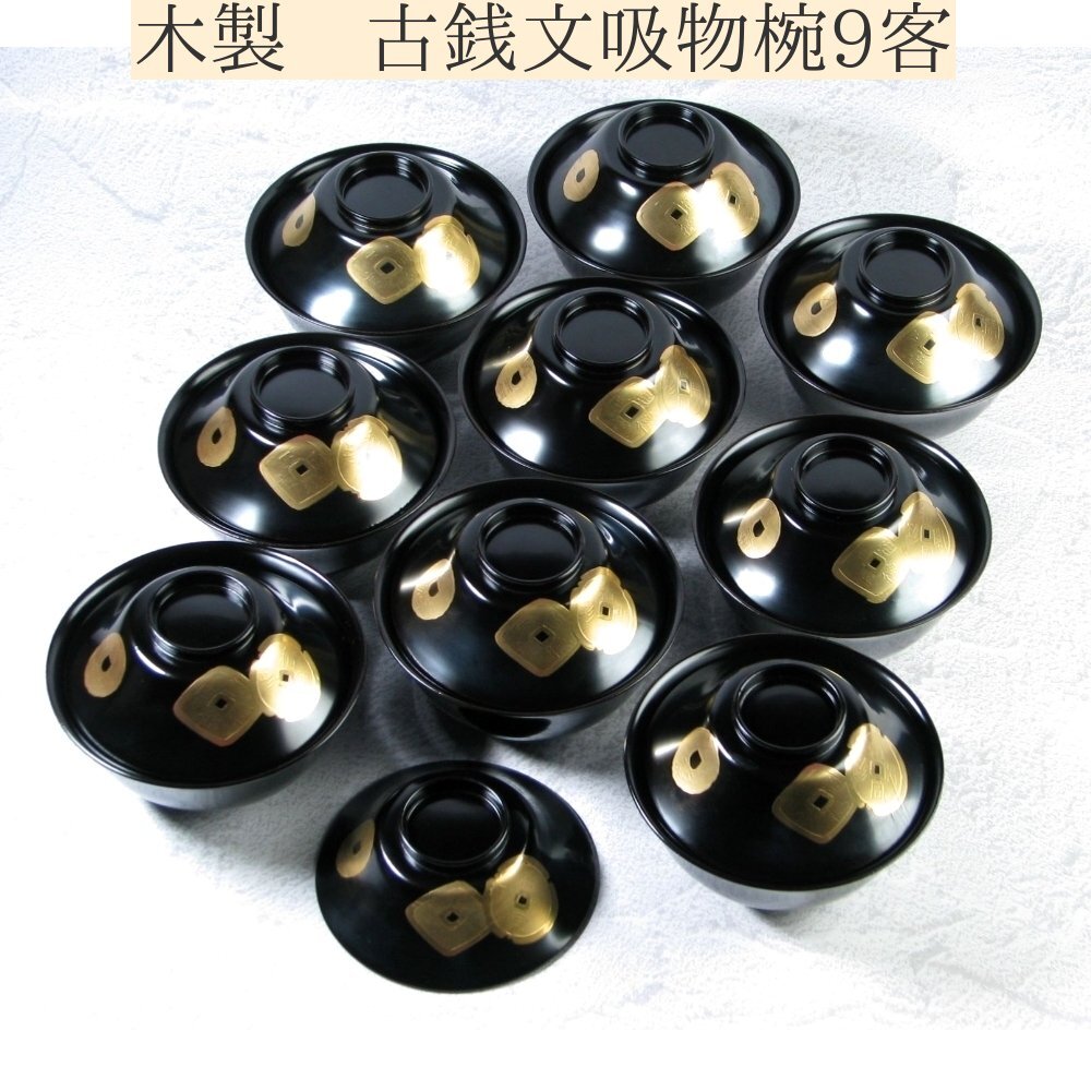 - 木製 黒漆 古銭文吸物椀9客 幅:11.8cm 美品/24i013