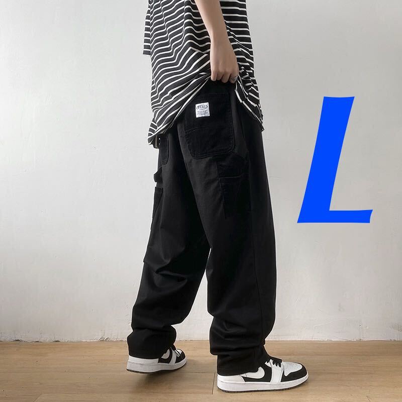 - ワイドパンツ ボトムス コーデュロイ ストレートパンツ ワイド ストレート カーゴパンツ カーゴ ユニセックス ブラック 黒 L