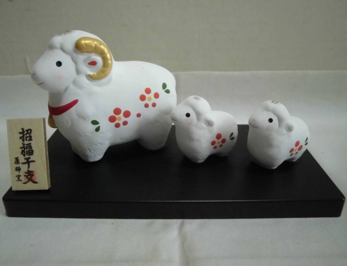 - 干支置物 未 親子 計3体 飾り台付 薬師窯 紅梅 錦彩 箱入り 色絵 金彩 羊 ひつじ 陶人形 土人形 招福 開運 縁起物 飾り物 オブジェ 工芸品