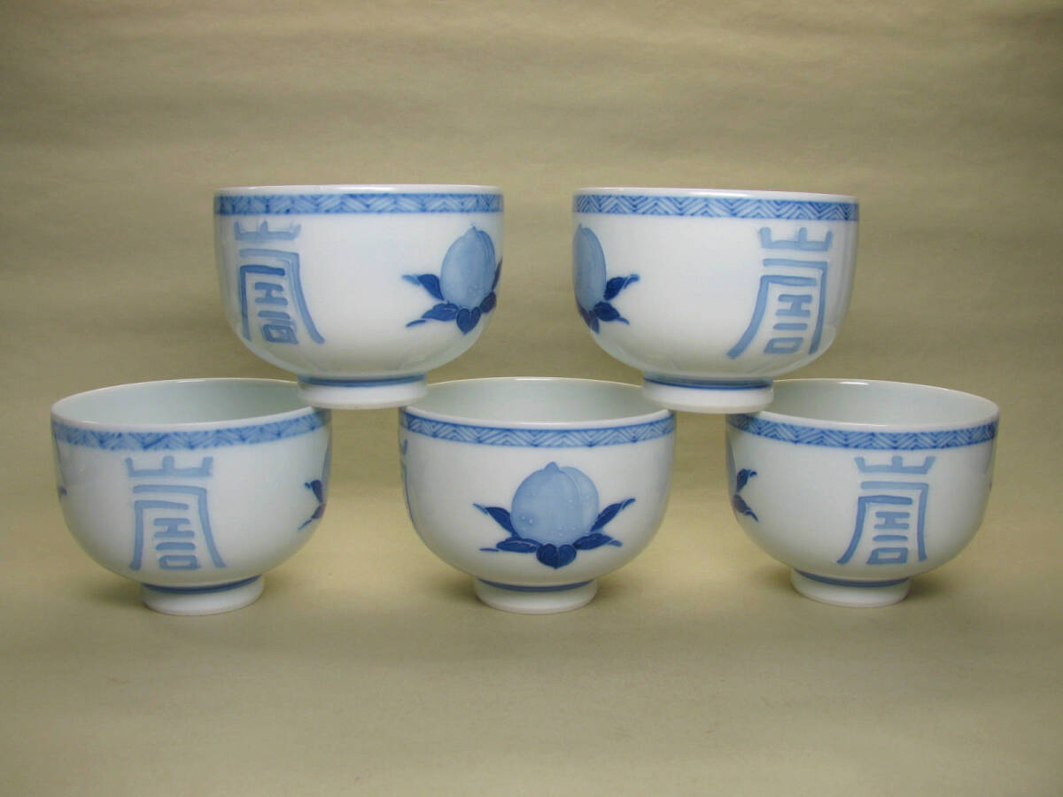 - [大幸] 翠峯造 白釉陽刻染付吉祥画汲出碗5客揃い 良美品 京焼 煎茶道具 湯呑 煎茶碗 番茶器