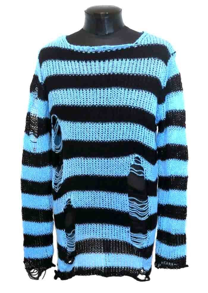 > 新品 ゴシック パンク ダメージ ボーダーニット 水色 黒1693 セーター ヴィジュアル系 グランジロック 地雷系 パンク ロック ハロウィン