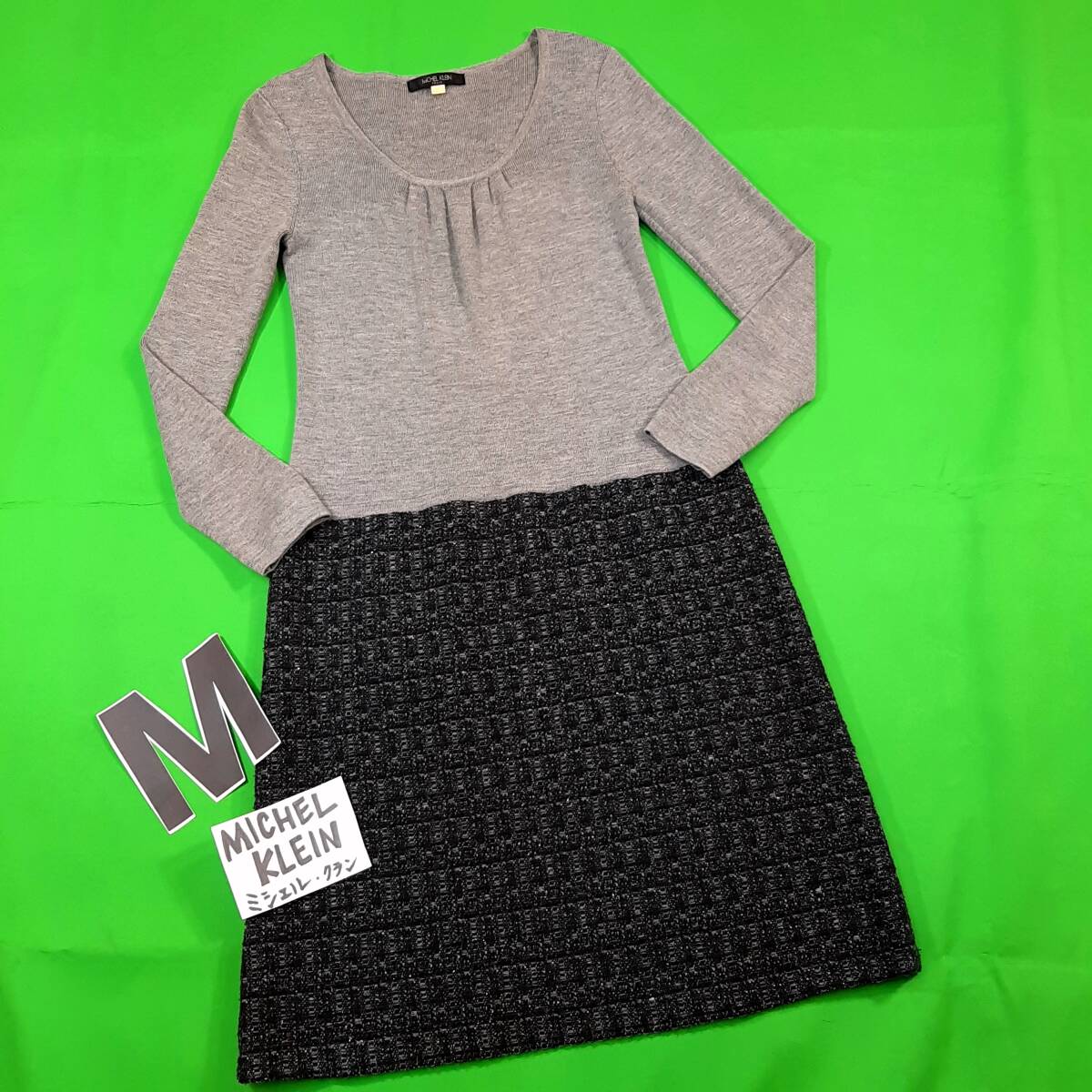 - b2 送料無料★MICHEL KLEIN★長袖ワンピース ニット&ツイード切替 ストレッチ バイカラーチュニック 膝丈★Mサイズ グレー 秋冬