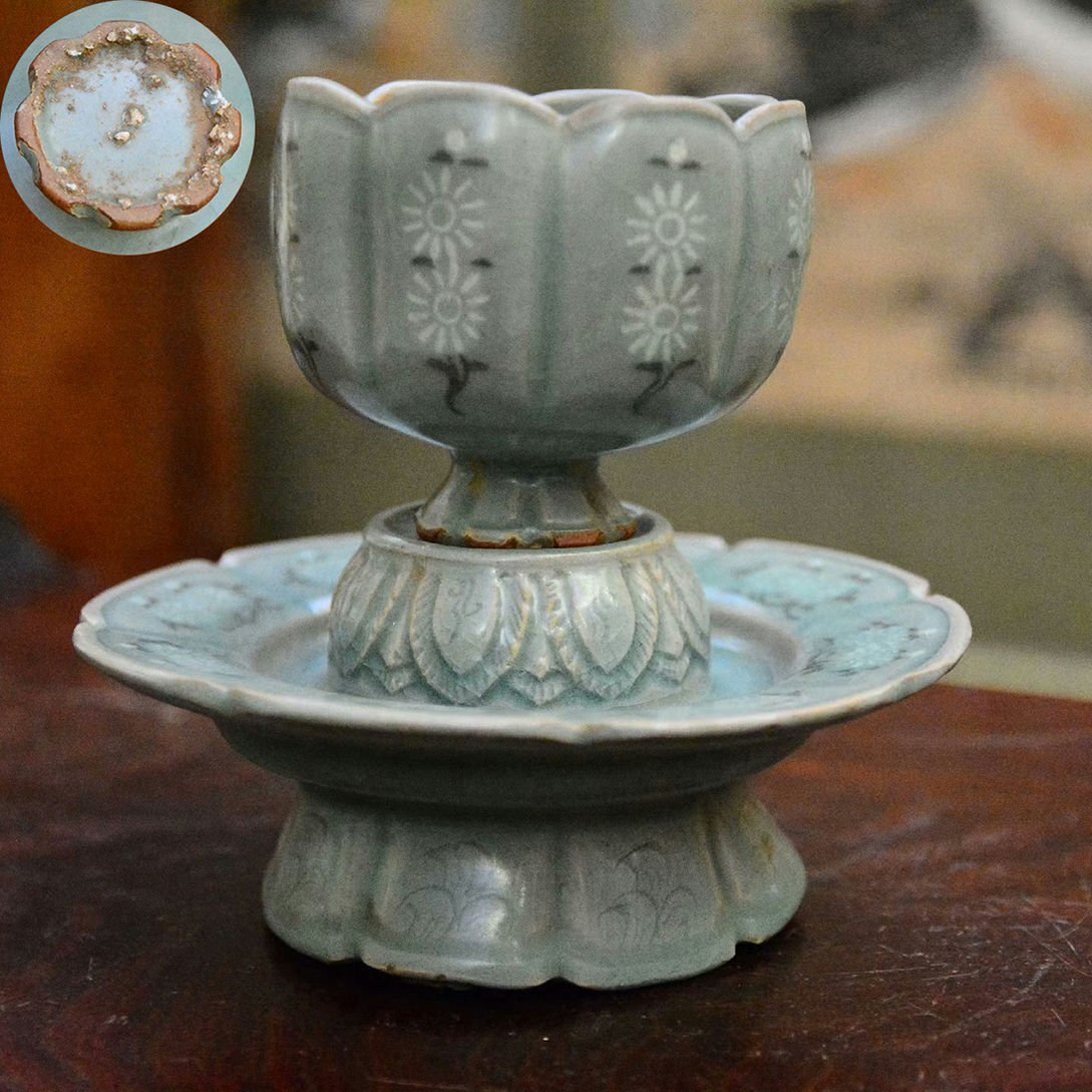 - ▼渡鶴羽▼P342珍品旧蔵 朝鮮 高麗磁 朝鮮古陶磁器 古高麗 李朝時代 高麗青磁陽刻象嵌草花紋盞