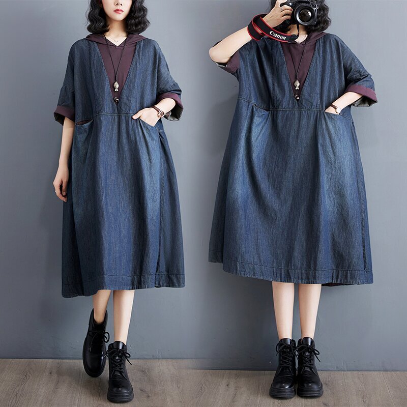 - 新品 人気推薦 /デニムワンピース 半袖 膝丈 Aライン きれいめ 可愛い フード付き カジュアル ひざ丈ワンピース 森ガール 体型カバー/L