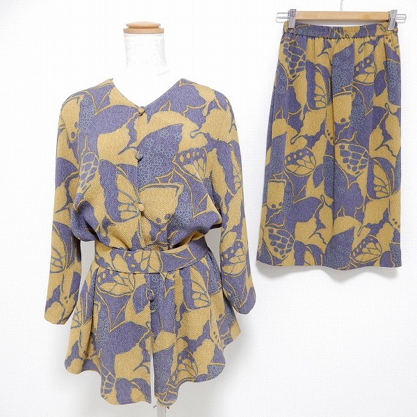 - #anc Ts コレクション 詩仙堂 ヒトシタムラ セットアップ ツーピース 黄土色 紫系 総柄 ちりめん ベルト紐付き レディース [907662]