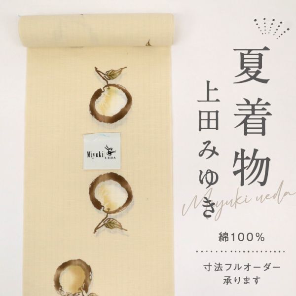 - 【反物】 ブランド浴衣 『Miyuki ueda』 梨 クリーム色 木綿 夏着物 お仕立て可 反24-218
