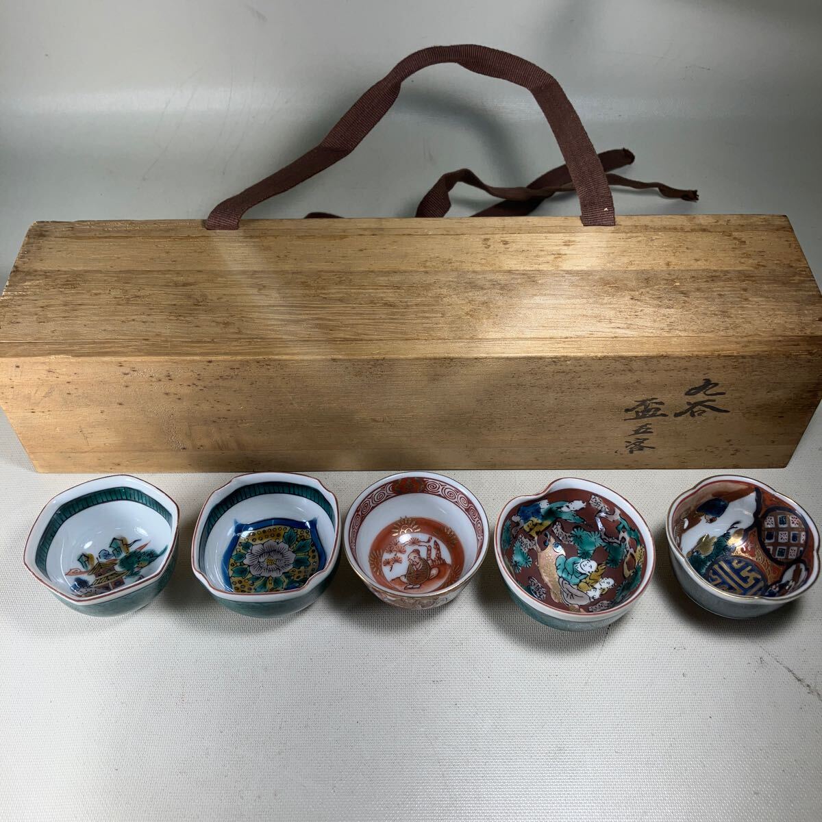 > 九谷盃五客 五十吉、木米、庄三、八郎 彩九谷名匠5客 青九谷 赤絵 合い箱 酒器 盃 酒盃 お猪口 ぐい呑み