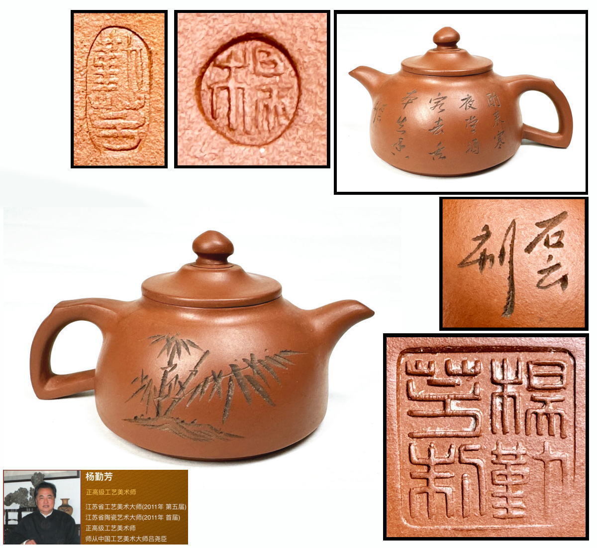 - 【送料無料】中国宜興 楊勤芳大師匠作 紫砂 詩紋山竹文茶壺 在銘 刻印あり 唐物 美術 骨董品 煎茶道具 朱泥 急須 (旧家蔵出し) WWTT026