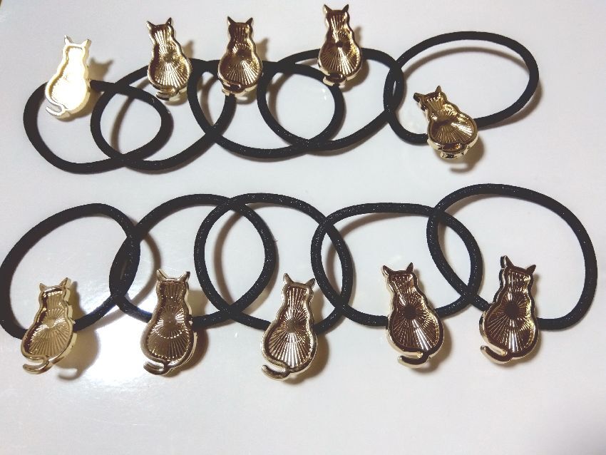 - 手芸用品き37■ネコ型レジン皿土台付き黒ヘアゴム10本セット■ゴールドパーツヘアアクセサリーハンドメイド資材
