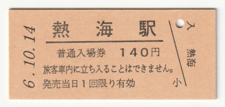 - 平成6年10月14日 東海道本線 熱海駅 140円硬券普通入場券(日付印刷)