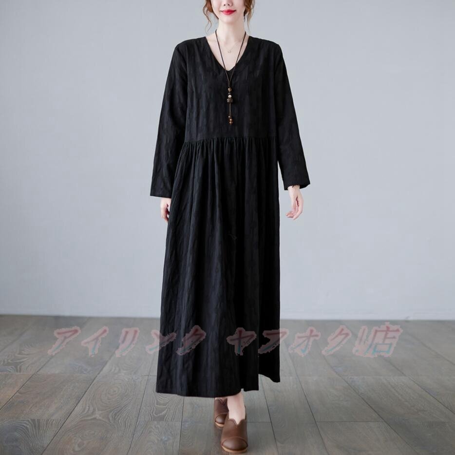 > ☆新品L-X サイズ選択可 春 カジュアル Vネック コットン綿麻 20304050代 体型カバー大きいサイズ 長袖 ロングワンピース 黒