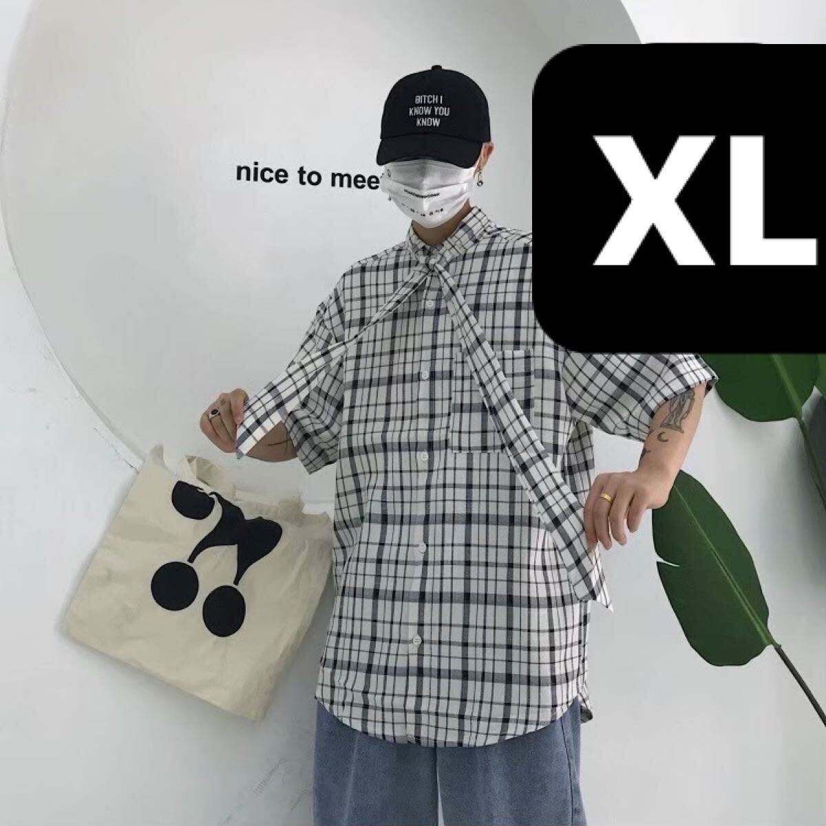 - シャツ タイ アウター ビッグシルエット チェック トップス 半袖 トレンド ストリート 人気 オルチャン メンズ レディース ホワイト 白 XL