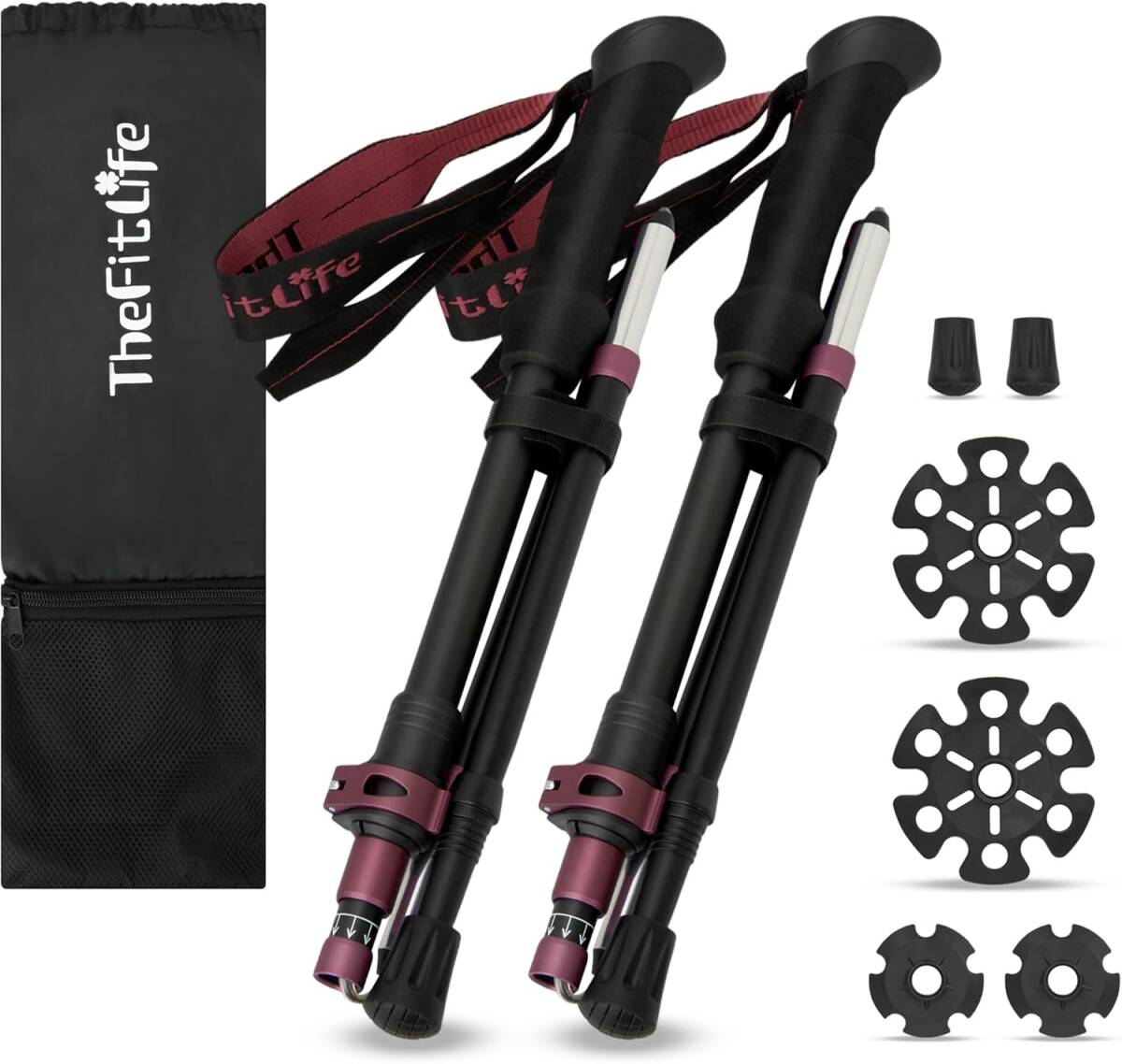 - 【新品】 TheFitLife トレッキングポール 折畳み 登山 ストック 軽量 100-120cm伸縮 2本セット暗紅色