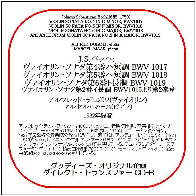 - J.S.バッハ:ヴァイオリン・ソナタ集/アルフレッド・デュボワ/送料無料/ダイレクト・トランスファー CD-R