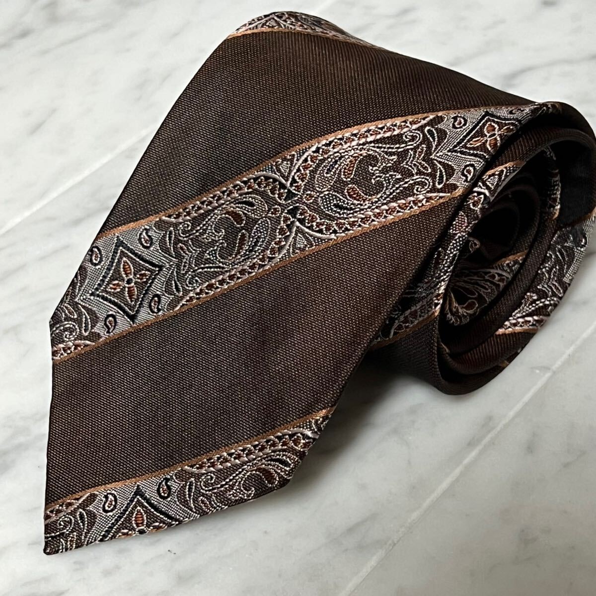 - 【美品】 770円~ ネクタイ ブラウン ストライプ 総柄 (GREEN B3)