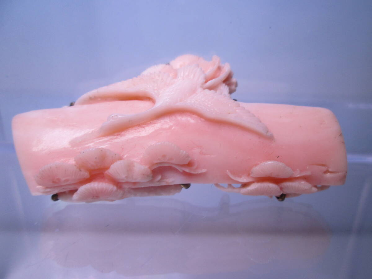 - ☆アンティーク・本珊瑚 ピンク珊瑚 吉祥 松に鶴彫刻の帯留め 21,94g