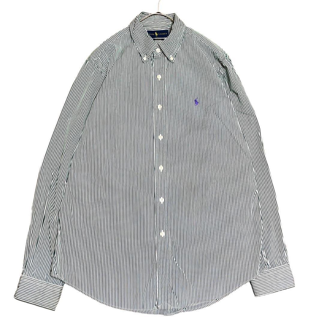 - ラルフローレン BD長袖シャツ 緑白ストライプ ポニー刺繍 US古着bw9① L相当