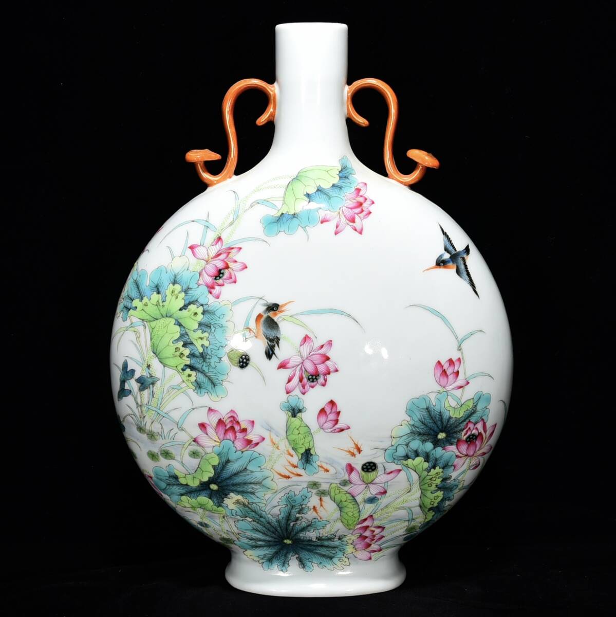 - ◆蔵出◆古美術 中国古玩 大清乾隆年製款 粉彩 荷叶花鳥紋抱月瓶 時代物 A06