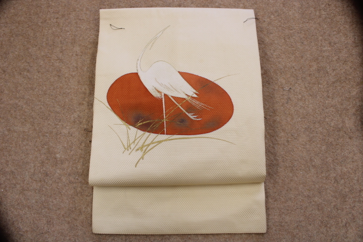 > きもの今昔7835 名古屋帯 正絹極小さな市松状の織りに、お太鼓と前腹に手描きの白鷺の柄 仕立て閉じしてます 未使用品