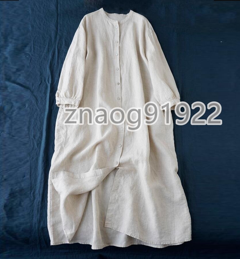 - 新品 ロングワンピース リネン綿麻 長袖 大きいサイズ カジュアル 大人 無地 シャツワンピース★麻色/2XLサイズ