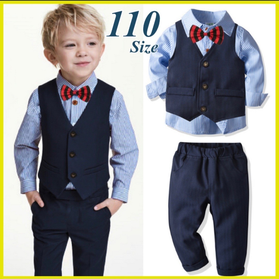 - 110 4点セット 男の子 フォーマル キッズ 長袖 ネイビー ストライプ 卒業式 入園式 ベストスーツ 七五三 結婚式 正月