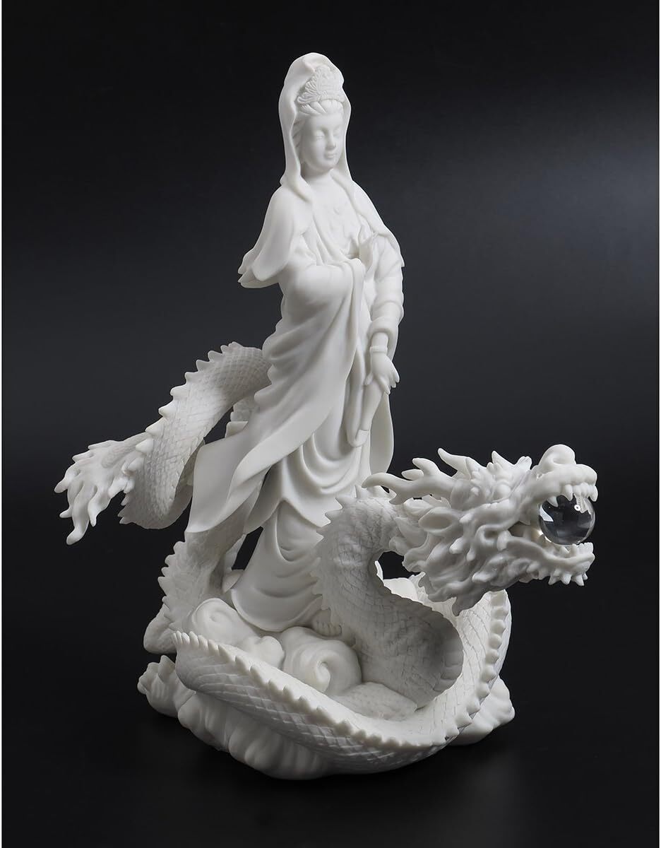 - 幸運の白龍 騎龍観音 龍に乗る観音菩薩彫像 慈悲と慈愛の女神 観音彫刻大理石風彫像アート工芸輸入品