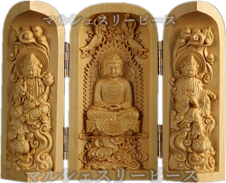 - 仏像 三開仏 観音像【勢至菩薩阿弥陀如来観音菩薩】木彫り ミニ 仏壇 仏箱 仏龕 置物 (高さ10cm×巾13cm×奥行5.5cm)