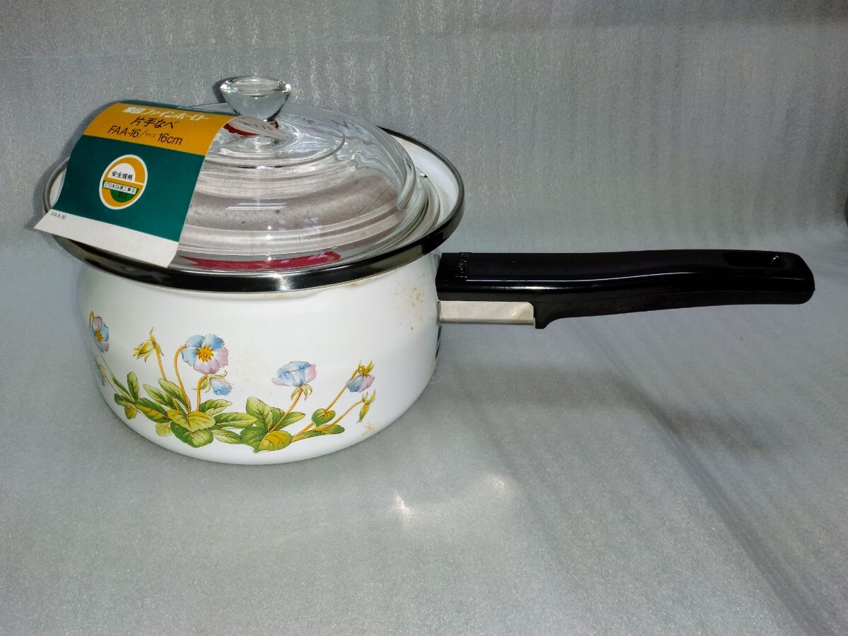 - K641【未使用】 象印ファインホーロー ガラス蓋 16cm ホーロー片手鍋 FAA-16 パンジー 花柄 長期保管