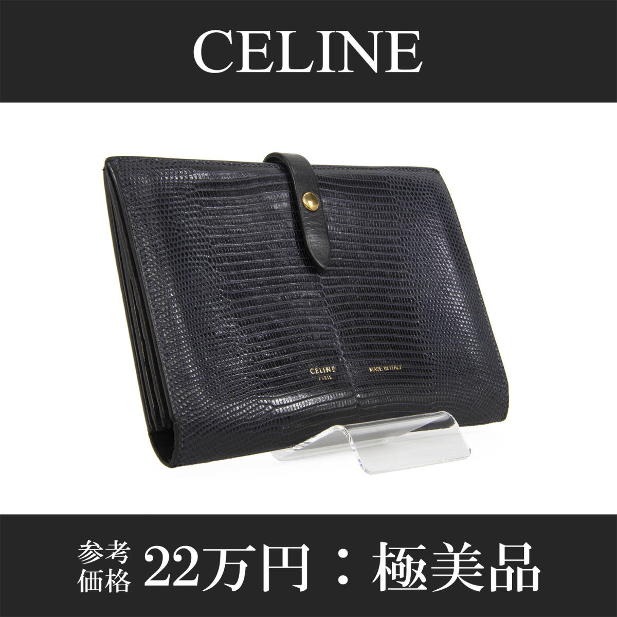 - 本物 送料無料 セリーヌ 長財布 レディース リザード ラージストラップウォレット ネイビーブルー ブラック ゴールドロゴ マーク 綺麗 D176