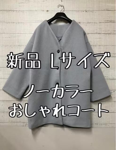 - 新品☆Lサイズ♪サックスブルー系♪ノーカラーおしゃれコート♪☆s198