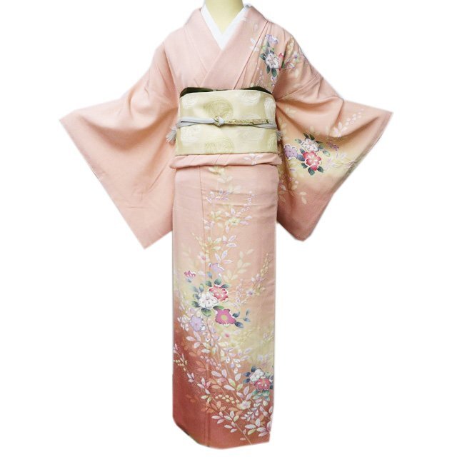 - 訪問着 着物 中古 正絹 袷 フォーマル 花の図 絞り 暈し 洗柿色 多色 身丈167cm 裄65cm L トール きもの北條 A1115-13