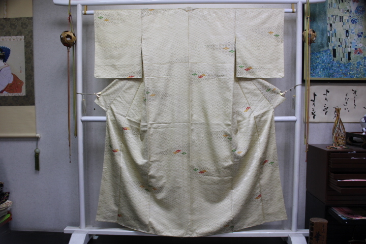 > きもの今昔7865 合繊きもの ポリエステル100%りんず地クリーム色青海波模様小紋 身丈154cm