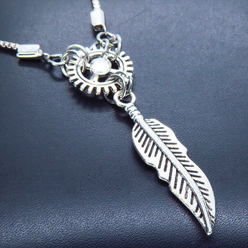 - アンティークシルバー フェザーと歯車を組合せたコンパクトなネックレス ラインストーン 長さ調整可