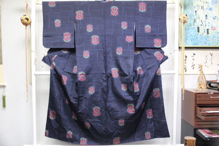 > きもの今昔7871 紬のきもの 広衿袷手縫い仕立て 十日町高級紬地 手機の十日町絣黒地に遠州椿図案柄 身丈152cm