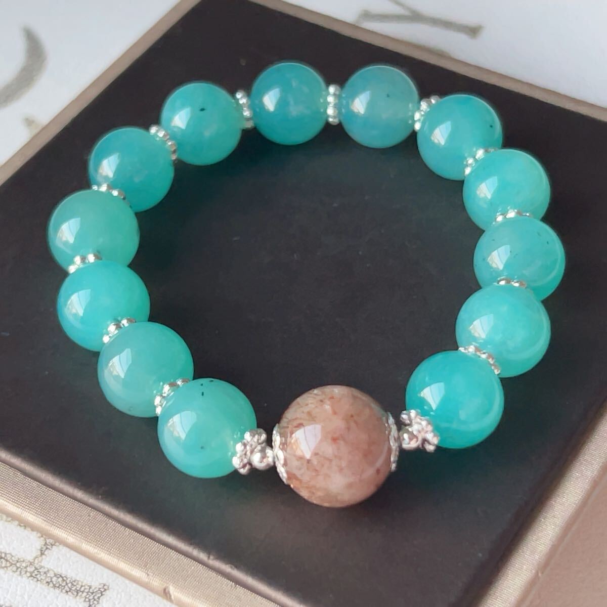 > ◇アマゾナイト+ブラックゴールドスーパーセブン1粒 ◇ブレスレット◇パワーストーン◇天然石◇巾着袋付き◇プレゼントにも020B11206