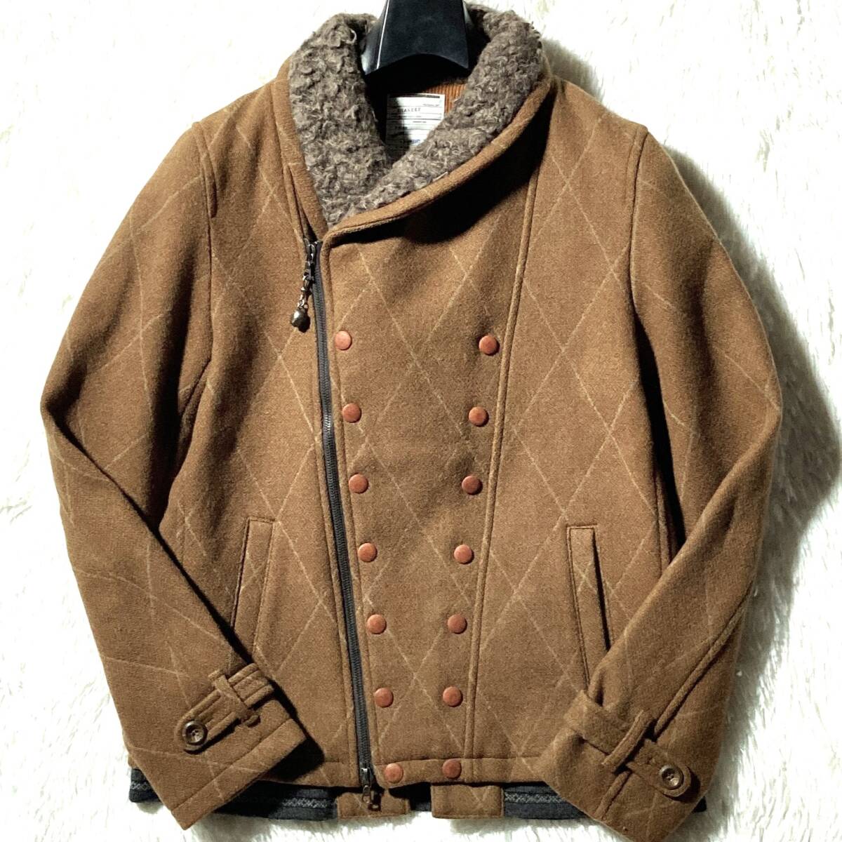 - SHAREEF★名作アーカイブ★ダイヤチェック ナポレオン ライダースジャケット ブルゾン 襟ボア メルトンウール 茶 2 シャリーフ モード優雅