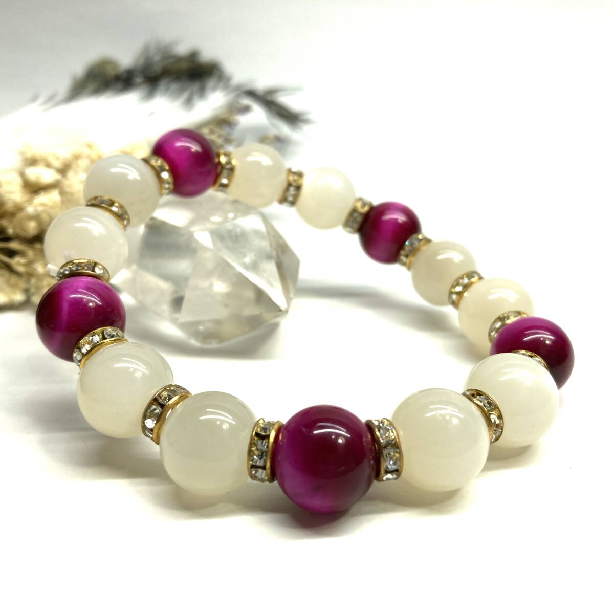 - ムーンストーン&ピンクタイガーアイ パワーストーン ブレスレット 天然石ブレス (ゴールド) 12mm 幸運 開運 メンズ 男性 □
