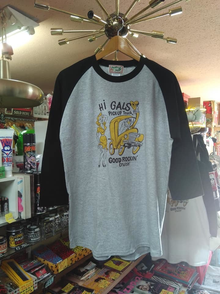 > XLサイズグッドロッキンラグラン7分袖Tシャツピックアップ柄黒×グレー色 検索ラグランスリーブロカビリーホッドロッドブラックキャッツ