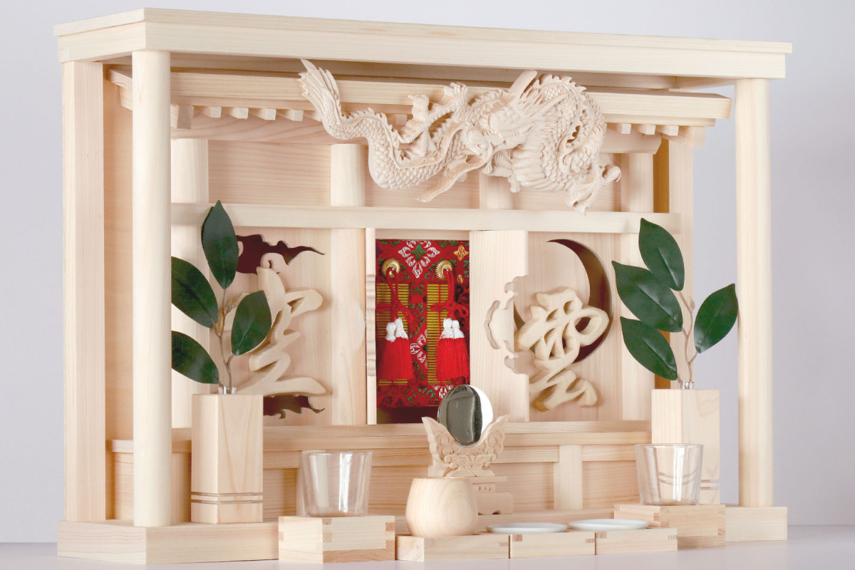 - モダン 神棚セット 月下龍神 眠り龍の破風 別宮 ITSUKI 桧製 神具付き