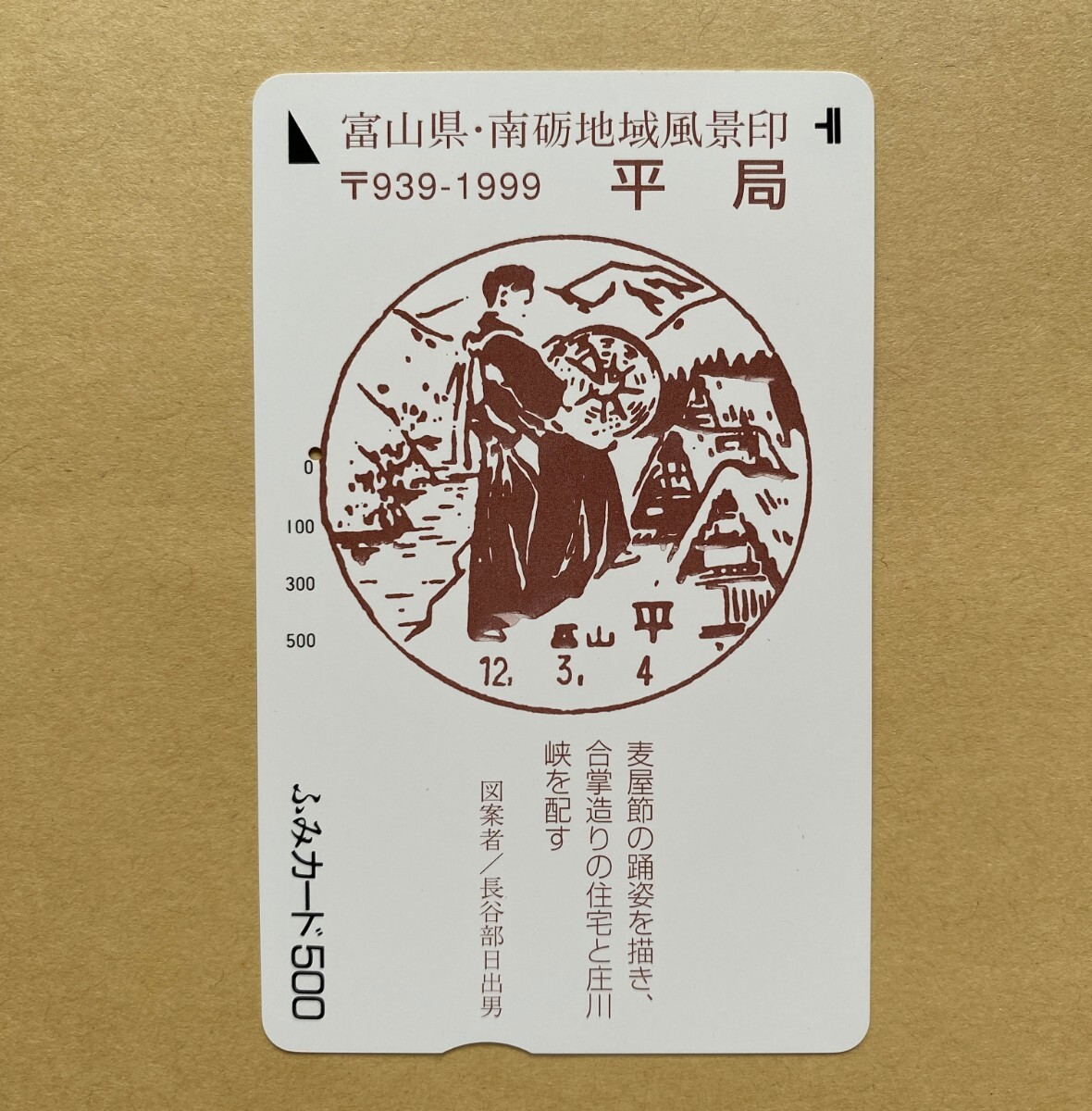 > 【使用済】 ふみカード 富山県・南砺地域風景印 平局 麦屋節の踊姿を描き、合掌造りの住宅と庄川峡を配す