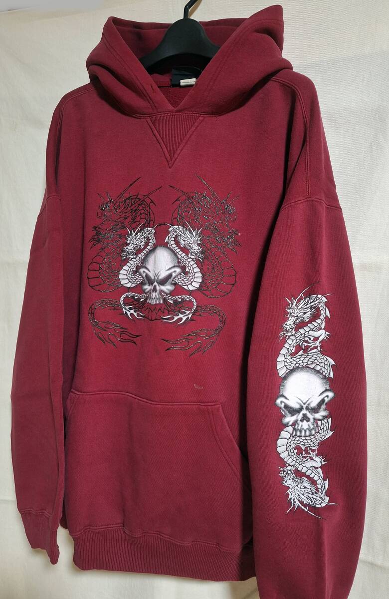 > スカル ドラゴン 古着 パーカー プルオーバー フーディー XL エンジ ボルドー ワインレッド ヴィンテージ Vintage PULL OVER HOODIE