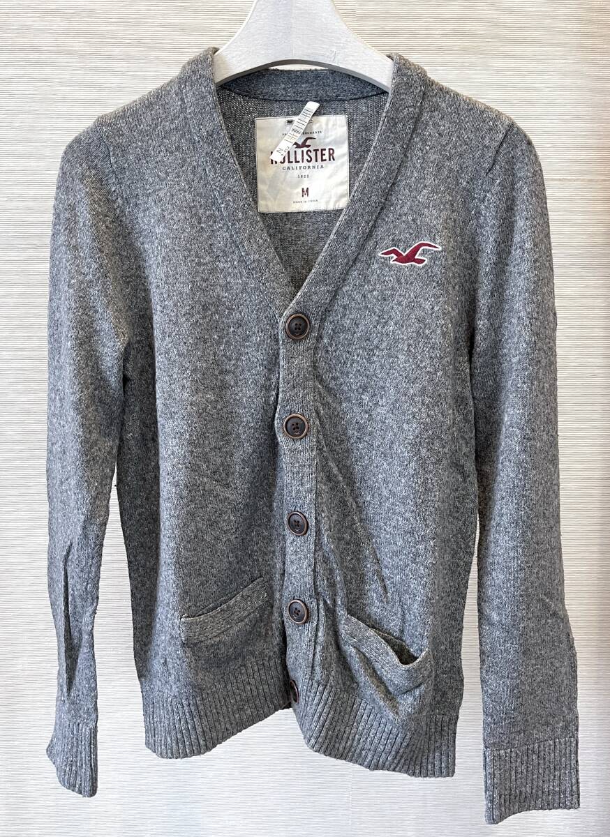 > HOLLISTER ホリスター カーディガン メンズM 杢グレー 赤白 ロゴ刺繍 Vネック ニット やわらかい手触りボタンに刻印 クリーニング済 DR5