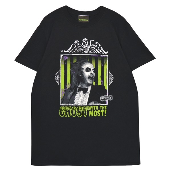 88年公開の奇才ティム・バートン監督によるファンタジーホラーコメディー映画「ビートルジュース」。 公開当時11週連続でトップ10入りを果たすなど大ヒットを記録、その年のアカデミー賞にてメイクアップ賞を受賞するなどティム・バートン監督の出世作となった作品でもあります。 その後はテレビアニメや舞台などにも幅を広げるなど、公開から数十年経過しているにもかかわらず根強い人気を誇る80年代を代表する名作です。 2024年9月には約34年ぶりとなる続編「ビートルジュース ビートルジュース」が劇場公開され、歳を重ねたオリジナルキャストの大半が続投するなど再び注目を集めました。 マイケル・キートン演じるビートルジュースと劇中の台詞「Ghost With The Most!」を合わせたデザインのTシャツ。 バンド公認のオフィシャルライセンス商品です。