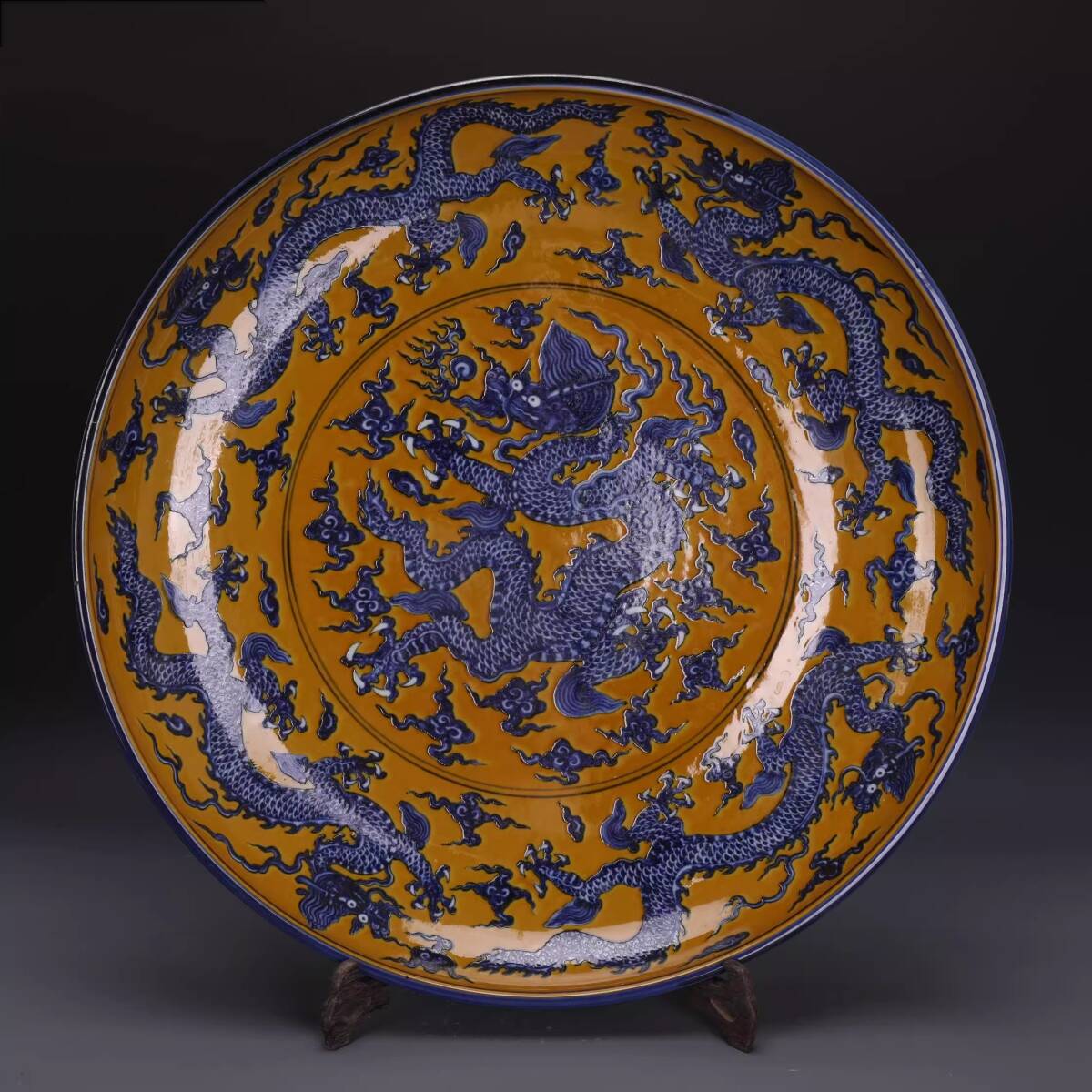 - ◆旧家蔵出◆ 古美術 中国古玩 大明宣徳年製款 青花 黄釉 五龍紋大盤 擺件 古賞物 骨董 時代物 CN01