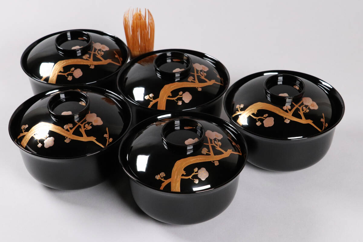 - 木製漆器 梅蒔絵 黒塗 椀 五客 漆芸 茶懐石 会席道具【MA287】
