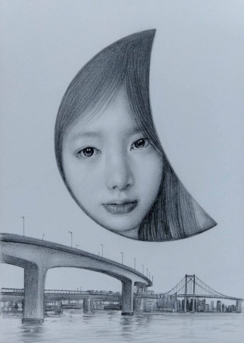 - 鉛筆画 美人画 「月の窓辺№.018 レインボーブリッジ」 Atelier809 真作 A4サイズです。 ※額縁は付いていません。